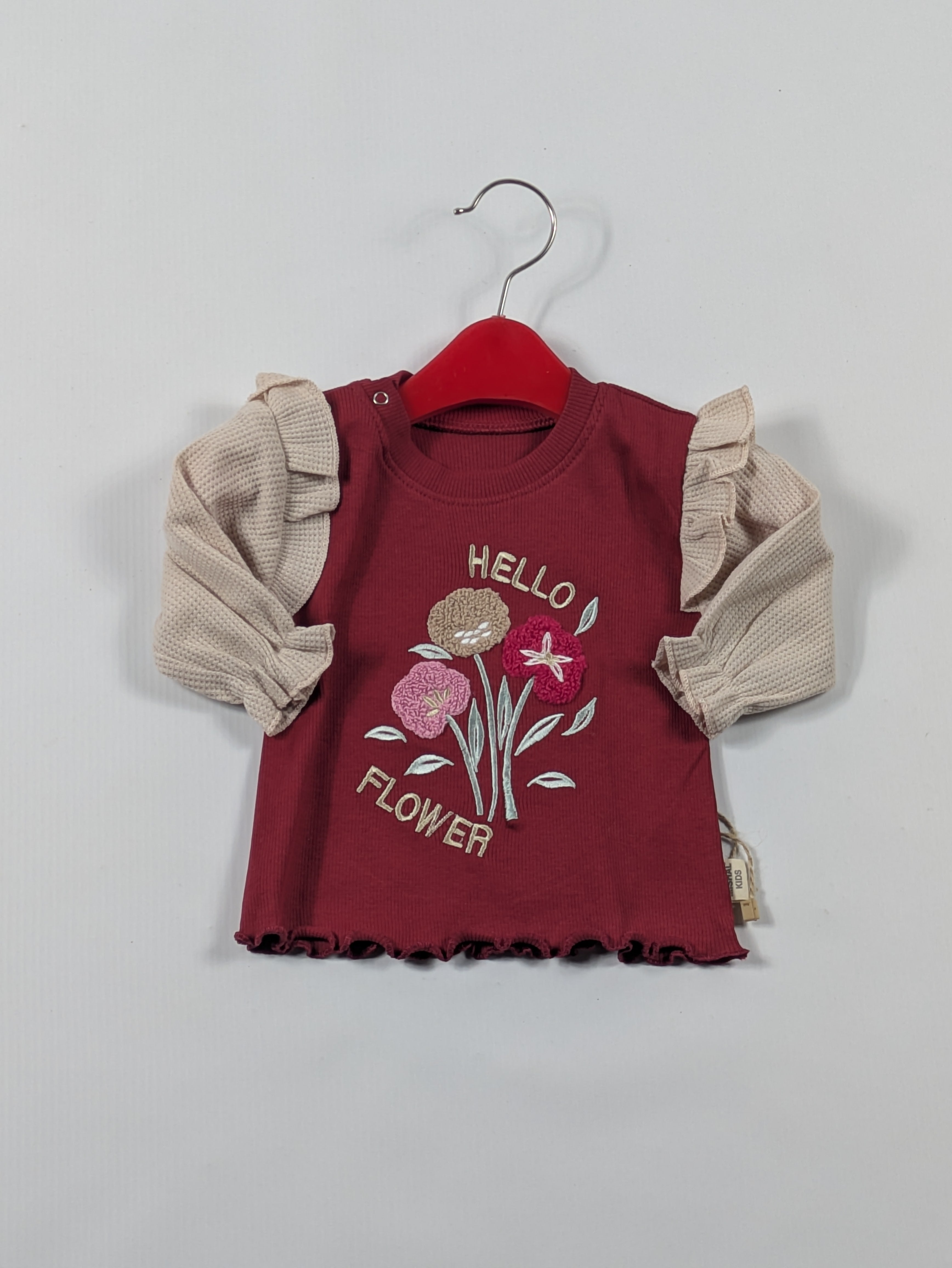 • Features a colorful "Hello Flower" embroidery patch.